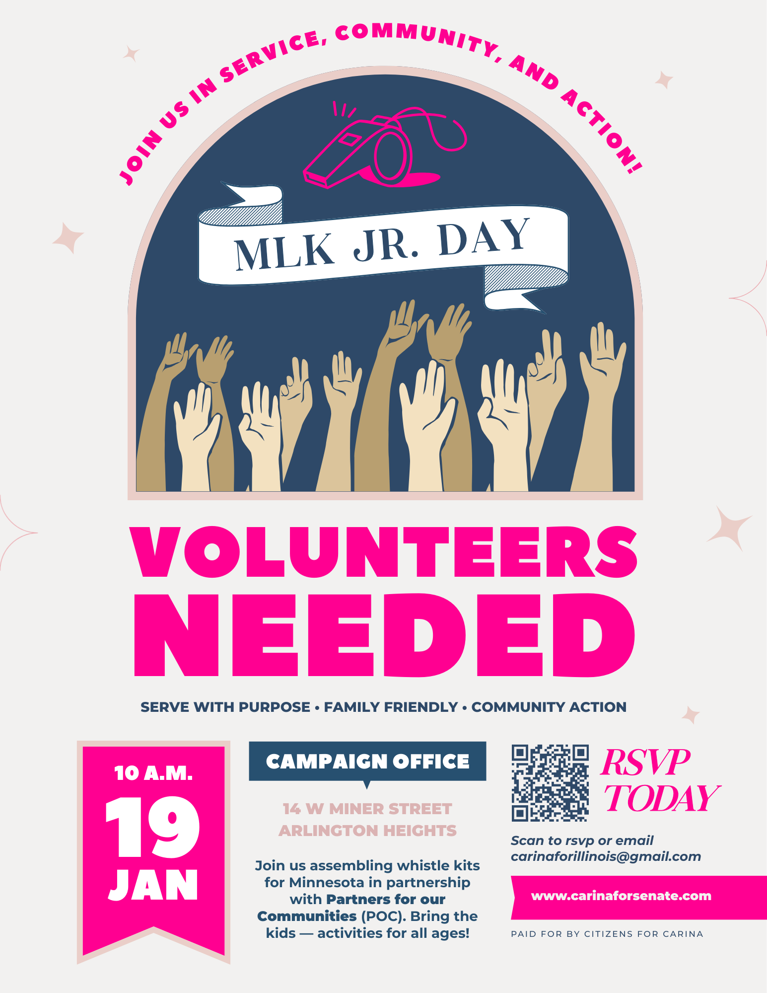 On Monday, January 19, we’re gathering at our new campaign office to assemble whistle kits that will be sent to Minnesota, in conjunction with our work with Partners for our Communities. This is a hands-on volunteer opportunity that directly supports safety and empowerment efforts beyond our district.
